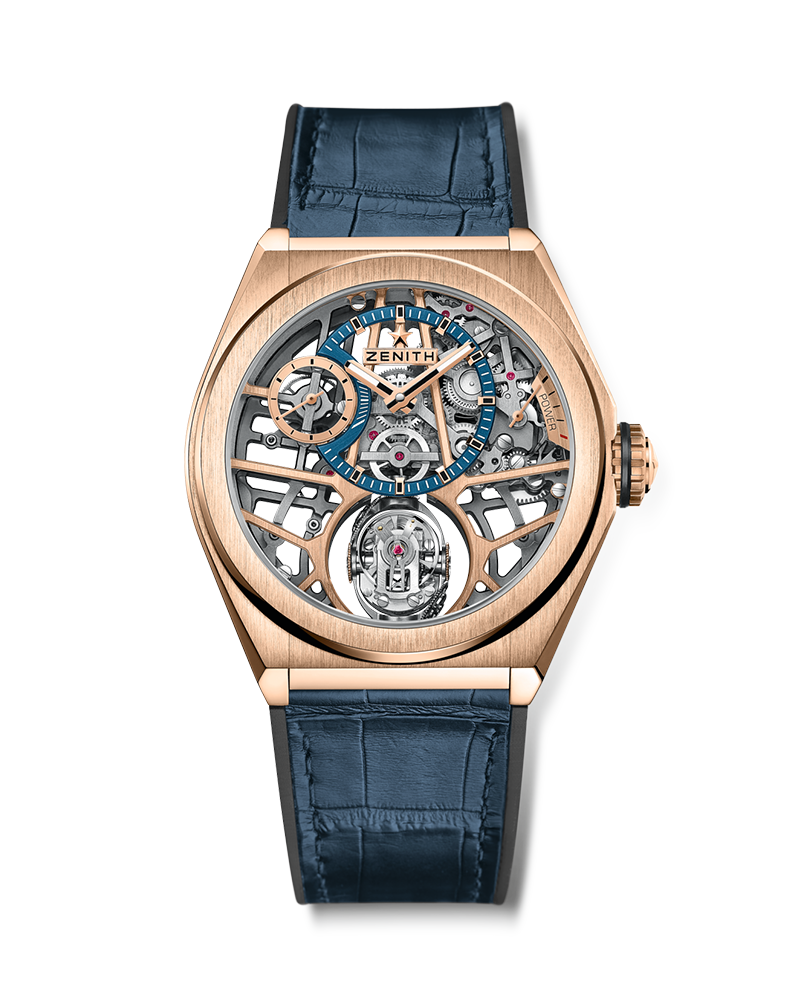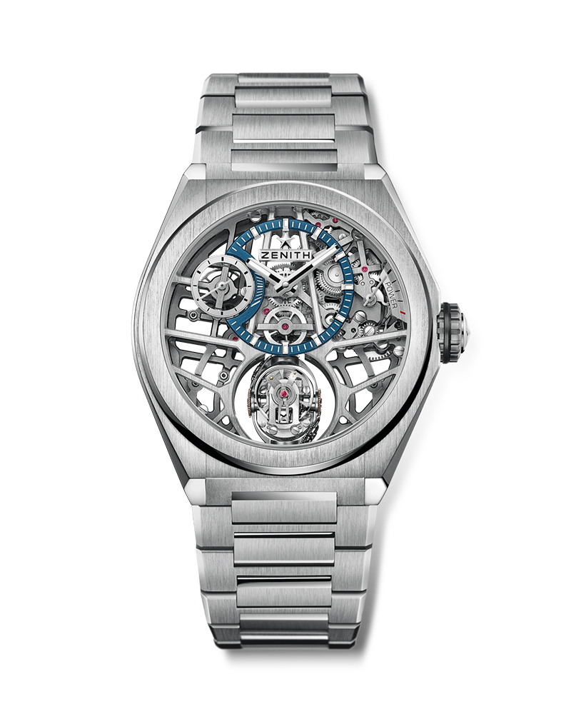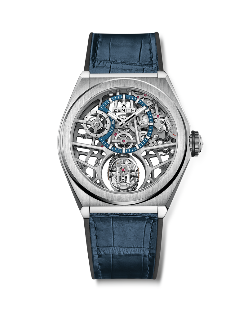 The DEFY Skyline Chronograph Skeleton in a 42mm steel octagonal case with a faceted bezel,...