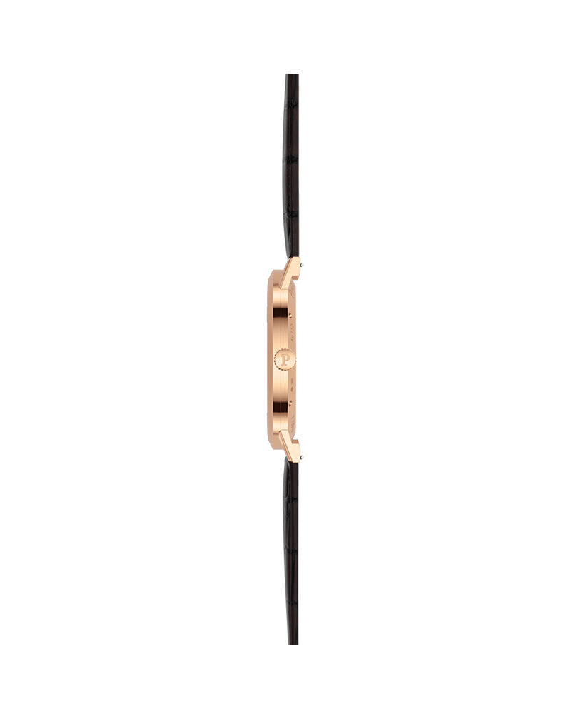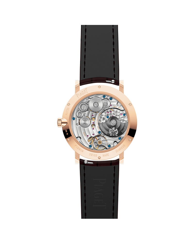 Altiplano Origin watch, 40 mm. Case in 18K rose gold. Dial with hour markers in rhodied gold. Sapphire crystal case back. Interchangeable strap. Manufacture 1205P1, ultra-thin automatic mechanical movement (3 mm thick), with small seconds and date.