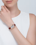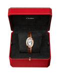 ["Baignoire watch, small model, quartz movement. 18K pink gold case. Faceted 18K pink gold crown set with a faceted sapphire. Dial with silvered sunray effect, Roman numerals. Blued-steel sword-shaped hands. Sapphire crystal. Shiny dark brown leather strap with 10 mm 18K pink gold ardillon buckle."]