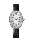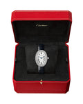 Baignoire watch, small model, quartz movement. White gold 750/1000 case set with brilliant-cut diamonds. White gold 750/1000 beaded crown set with a brilliant-cut diamond. Silver dial, blued-steel sword-shaped hands, sapphire crystal. Strap in navy blue leather, with rhodiumized white gold 750/1000 ardillon buckle. Case dimensions: 32 mm x 26 mm. Thickness: 8 mm. Water-resistant up to 3 bar (approx. 30 meters/100 feet).