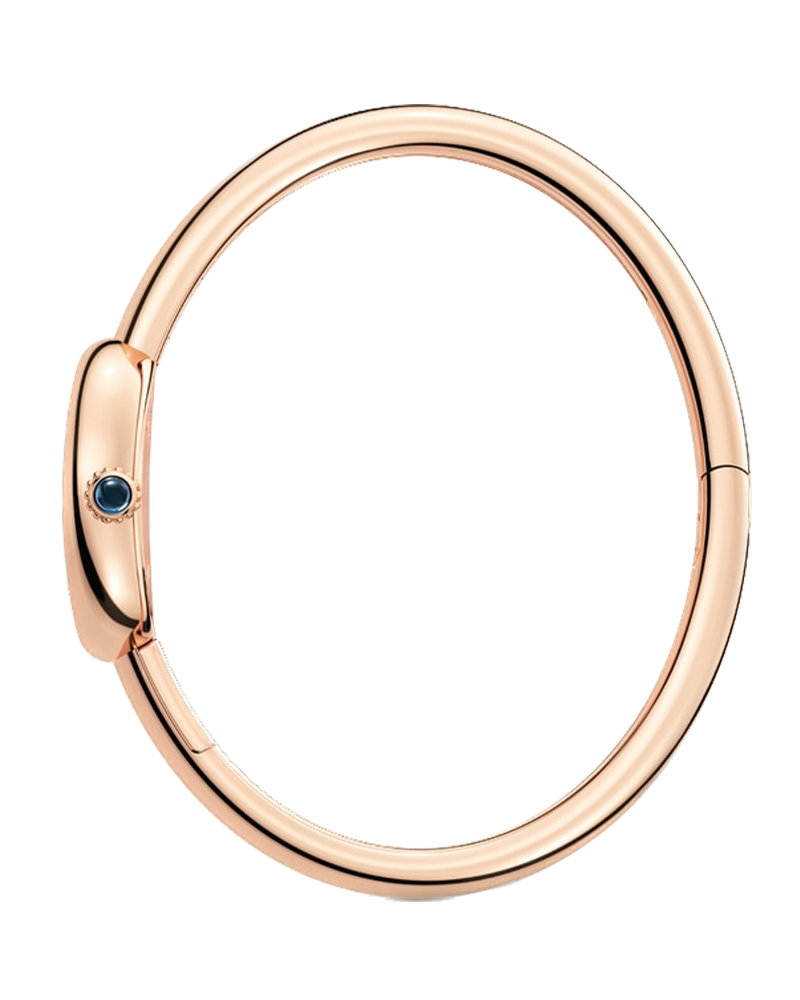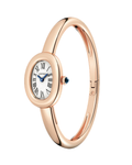 Baignoire de Cartier watch, mini model, size 16, quartz movement. 18K rose gold (750/1000) case. 18K rose gold (750/1000) beaded crown set with a sapphire cabochon. 18K rose gold (750/1000) rigid bracelet. Silvered dial, blued-steel sword-shaped hands, sapphire crystal. Length: 24.6 mm, width: 18.7 mm, thickness: 7.2 mm. Water-resistant up to 3 bar (approx. 30 meters).