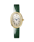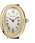 Baignoire de Cartier watch, small model, quartz movement. Yellow gold 750/1000 case set with 42 brilliant-cut diamonds totaling 0.48 carats. 18K yellow gold (750/1000) beaded crown set with a 0.08-carat diamond cabochon. Silvered dial, blued-steel sword-shaped hands, sapphire crystal. Varnished green alligator-skin strap, 18K yellow gold (750/1000) ardillon buckle. Length: 31.4 mm, width: 23.09 mm, thickness: 6.95 mm. Water-resistant up to 3 bar