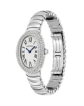 Baignoire de Cartier watch, small model, quartz movement. 18K white gold (750/1000) case set with 227 brilliant-cut diamonds totaling 2.3 carats. 18K white gold (750/1000) beaded crown set with a diamond cabochon totaling 0.08 carats. Silvered dial, blued-steel sword-shaped hands, sapphire crystal. Rhodium-finish 18K white gold (750/1000) bracelet. Length: 31.4 mm, width: 23.1 mm, thickness: 7.6 mm. Water-resistant up to 3 bar (approx. 30 meters/100 feet).