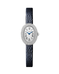 Baignoire de Cartier watch, mini model, quartz movement. Rhodium-finish 18K white gold (750/1000) case and beaded crown set with 160 brilliant-cut diamonds totaling 1.9 carats. Silvered dial, blued-steel sword-shaped hands, sapphire crystal. Varnished navy blue calfskin strap, 18K white gold (750/1000) ardillon buckle. Length: 24.6 mm, width: 18.7 mm, thickness: 7.2 mm. water-resistant up to 3 bar (approx. 30 meters/100 feet).