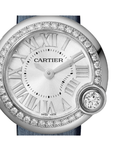 Ballon Blanc de Cartier watch, 26 mm. Quartz movement. Steel case with one diamond at 4 o’clock and set with 37 brilliant-cut diamonds, totalling 0.56 carat. Silvered sunray-brushed dial. Sword-shaped hands Sapphire crystal. Calfskin strap, steel ardillon buckle. Case thickness: 8 mm. Water-resistant to 3 bar (approx. 30 metres).