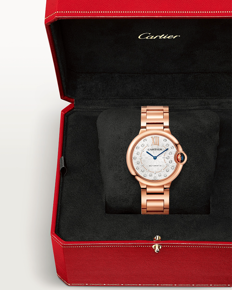 Ballon Bleu de Cartier watch, 36 mm. Self-winding mechanical movement. Rose gold 750/1000 case and fluted crown in rose gold 750/1000 set with a sapphire cabochon. Matt silvered stamped sunray dial set with 21 brilliant-cut diamonds totaling 0.19 carats. Blued-steel sword-shaped hands. Sapphire crystal. Interchangeable bracelet in rose gold 750/1000. Thickness: 0.47”. Water-resistant up to 3 bar (approx. 30 meters/100 feet).