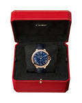 Ballon Bleu de Cartier watch, 42 mm. Mechanical movement with automatic winding, calibre 1847 MC. 18K rose gold case, fluted crown set with a sapphire cabochon, blue guilloche dial. Sword-shaped hands Sapphire crystal. Navy blue leather strap, interchangeable 18K rose gold folding buckle. Calendar aperture at 3 o clock.