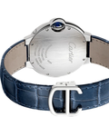Ballon Bleu de Cartier watch, 37 mm. Mechanical movement with automatic winding, moon phases. Case in steel, fluted crown set with a synthetic cabochon-shaped spinel. Silvered guilloché dial. Moon phases at 9 o’clock. Blued-steel sword-shaped hands. Sapphire crystal. Blue alligator-skin strap, interchangeable steel folding buckle. Case thickness: 13 mm. Water-resistant to 3 bar (approx. 30 metres).
