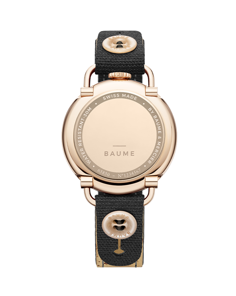 This BAUME watch is a 35mm timepiece featuring a gold PVD case and an opaline silver-couloured dial coupled with a black bevel and second hand. Its interchangeable strap is crafted in recycled cotton and features a gilted pin buckle.