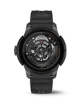 The tourbillon is one of the most sophisticated complications in fine watchmaking. As dozens of miniscule parts have to work together in a confined space, it is particularly vulnerable to shocks and damage. With the Big Pilot’s Watch Shock Absorber Tourbillon Skeleton, IWC’s engineering division XPL pushes the boundaries by combining its patented SPRIN-g PROTECT® shock absorber system with a tourbillon movement for the first time. First introduced in 2021, the SPRIN-G PROTECT® system uses a cantilever spring to cushion the movement and suspend it inside the case. In the event of an impact to the case, the movement is protected by the compressing spring system, reducing impact forces significantly. To adapt the shock absorber system to the IWC-manufactured 82915 caliber with a flying minute tourbillon, the shape of the spring had to be redesigned. Each of the eight arms was recalculated using advanced simulation tools and adapted to the dimensions and weight of the tourbillon movement. The re-engineered shock absorber underwent comprehensive testing using advances measurement methods. During these tests, protected tourbillon movements have survived the extreme forces from accelerations in excess of 10,000 g. The key to this extraordinary performance lies in the spring’s perfect form and material execution in bulk metallic glass (BMG). The spring is designed to evenly spread shock forces across its length and width. A highly complex manufacturing process gives BMG a disordered atomic-scale structure. This amorphous microstructure makes the material significantly more elastic than conventional metals – a key requirement for a shock absorber spring. Reducing the mass to be protected is critical for the shock absorber system’s performance. For this reason, the plates, bridges and rotor of the IWC-manufactured 82915 calibre are skeletonized. The dial is reduced to a simple black ring with the characteristic triangle at 12 o’clock and minute scale. Even the triangular hands, coated with Super-LumiNova®, are skeletonized. The flying minute tourbillon, consisting of 56 parts and weighing only 0.663 grams, is completely visible at 6 o’clock. This skeletonization approach allowed IWC’s engineers to reduce the weight of the movement as much as possible, maximizing the performance of the shock absorber system. The automatic movement features a Pellaton winding system reinforced with components made of virtually wear-free ceramic, which efficiently builds up a power reserve of 80 hours in the mainspring. The case and the crown of this watch are manufactured from Ceratanium®, an IWC-developed material that combines the lightness and structural integrity of titanium with a hardness and scratch-resistance similar to ceramic. This highly complex and futuristic Big Pilot’s Watch is fitted with a black rubber strap with a technical pattern, complete with a Ceratanium® pin buckle.