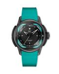 With the Big Pilot's Watch Shock Absorber XPL Toto Wolff x Mercedes-AMG PETRONAS Formula One™ Team, IWC has developed a watch that is engineered to withstand the enormous stresses and strains of Formula One™ – in the car cockpit and in the pit lane. Limited to 100 pieces, it combines IWC’s patented SPRIN-g PROTECT® shock absorber system with a distinctively technical design inspired by the team’s black and green color scheme. Developed by IWC’s engineering division XPL, the SPRIN-g PROTECT® system takes movement shock protection to a new level. A cantilever spring cushions the movement inside the case, protecting it from the g-forces generated by impacts on the case of the watch. In impact tests conducted at the Cavendish Laboratory at the Cambridge University, protected movements have survived forces from accelerations in excess of 30,000 g. The spring is designed with a special form and manufactured from a Bulk Metallic Glass (BMG). Thanks to its amorphous microstructure, this highly engineered material is significantly more elastic than conventional metals. For this limited edition, the BMG spring has been coated with Petronas-green Super-LumiNova® and glows in the dark. The case and the crown of this watch are made of Ceratanium®, and IWC-developed material that combines the lightness and robustness of titanium with a hardness similar to ceramic. The black dial features a grainy technical structure, which is stamped into the brass base with a special tool. The triangular black hands also feature Super-LumiNova® around their edges. The watch is powered by the IWC-manufactured 32101 caliber with an automatic winding system and power reserve of 120 hours. The plates, bridges and oscillating mass are blackened to match the all-black design, and the movement is visible through a tinted sapphire glass case back. The watch is fitted with an integrated Petronas green rubber strap. A black rubber strap with textile inlay is included as an accessory.