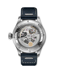 THE BIG PILOT'S WATCH 43 -No other model expresses the fascination of IWC Schaffhausen aviatorÕs watches like the Big PilotÕs Watch. Its purely functional cockpit-instrument design and oversized conical crown were inspired by a military observation watch from the 1940s. The Big PilotÕs Watch 43 is a faithful interpretation of this original design without any additional elements on the dial, and in a 43-millimetre stainless steel case that combines an amazing presence on the wrist with maximum wearing comfort. This model features a blue dial, rhodium-plated hands and a blue calfskin strap. Visible through the sapphire glass case back is the IWC-manufactured 82100 calibre. The Pellaton winding system has been reinforced with ceramic components and builds up a power reserve of 60 hours. The practical EasX-CHANGE system and a choice of straps in leather, rubber or stainless steel provide a high degree of flexibility. Combined with the now 10 bar water-resistant case, this transforms the Big Pilot's Watch 43 into a modern, fully versatile sports watch.