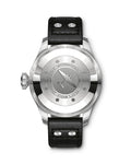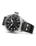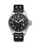 BIG PILOTÕS WATCH - In 2016, IWC took a step back towards the roots of the Big PilotÕs Watch and gave it a gentle facelift. The IWC-manufactured 52110-calibre movement unites some of watchmakingÕs greatest achievements. It features an efficient Pellaton automatic winding system with parts made from black or white ceramic. With the help of two barrels, it builds up a reserve of 7 days. The display at Ò3 o clockÓ indicates the time remaining until the movement comes to a stop. The Big PilotÕs Watch has a date display at Ò6 o clockÓ and the central seconds essential in any watch used for flying. The 46-millimetre case, which is water-resistant to 6 bar, encloses a soft-iron inner case that protects the movement against magnetic fields. The watch also features a striking conical crown. The legendary Junkers JU-52 plane is engraved on the case back of the Big PilotÕs Watch. This model comes with a black strap, which perfectly complements the watch.