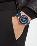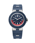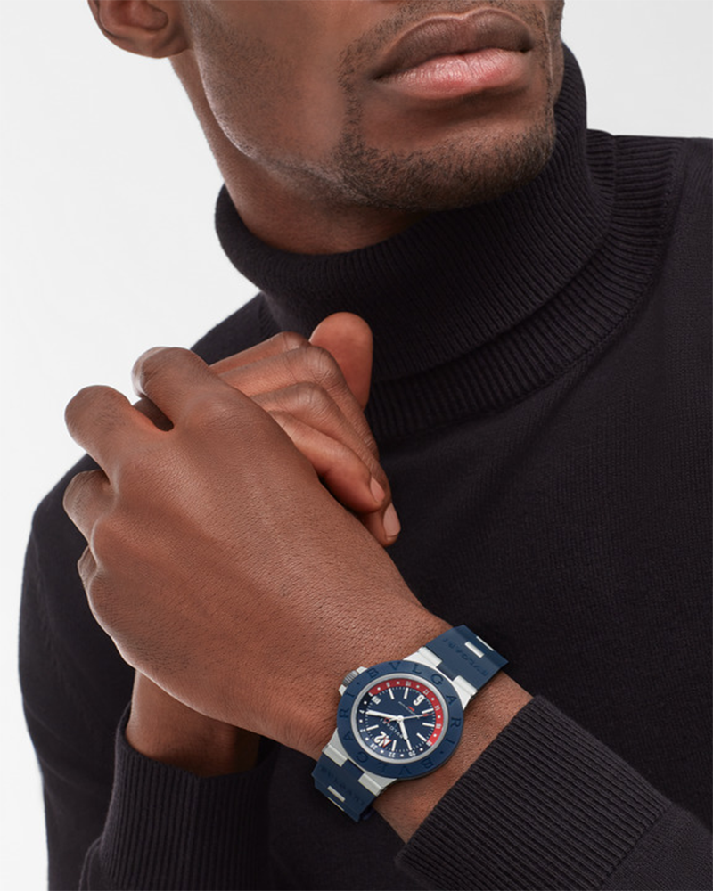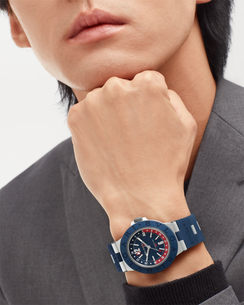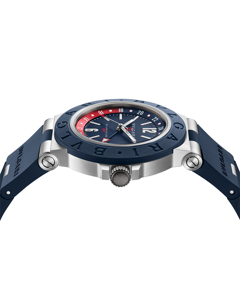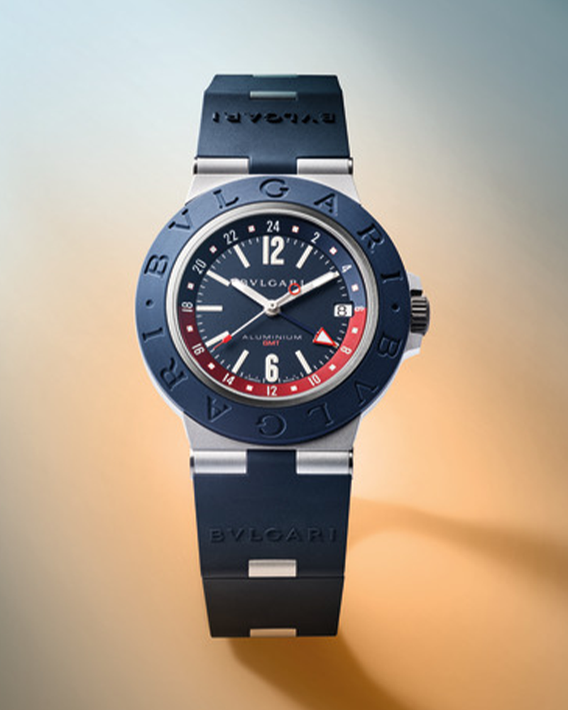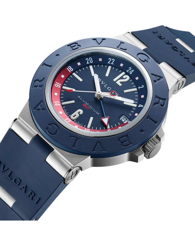 From the first-generation models launched in 1998, the Bvlgari Aluminium watch has redefined what a luxury sport watch can be. Made from completely unexpected materials, today's iconic timepiece flaunts the same pioneering allure of the original watch, speaking a universal language that goes far beyond gender, age, trends and eras. Simple yet striking, Bvlgari Aluminium keeps approaching the watchmaking world with a boldness and strength that feels refreshing and incredibly modern. BVLGARI Aluminium GMT watch with mechanical movement, automatic winding, hour, minutes, seconds, date and GMT 24h functions,50 hours power reserve. B192 calibre, 40 mm aluminium case, blue rubber bezel with double logo engraving, blue dial with SLN indexes and hands, date opening, titanium caseback, aluminium links, blue rubber bracelet and aluminium ardillon buckle. Water-resistant up to 100 metres.