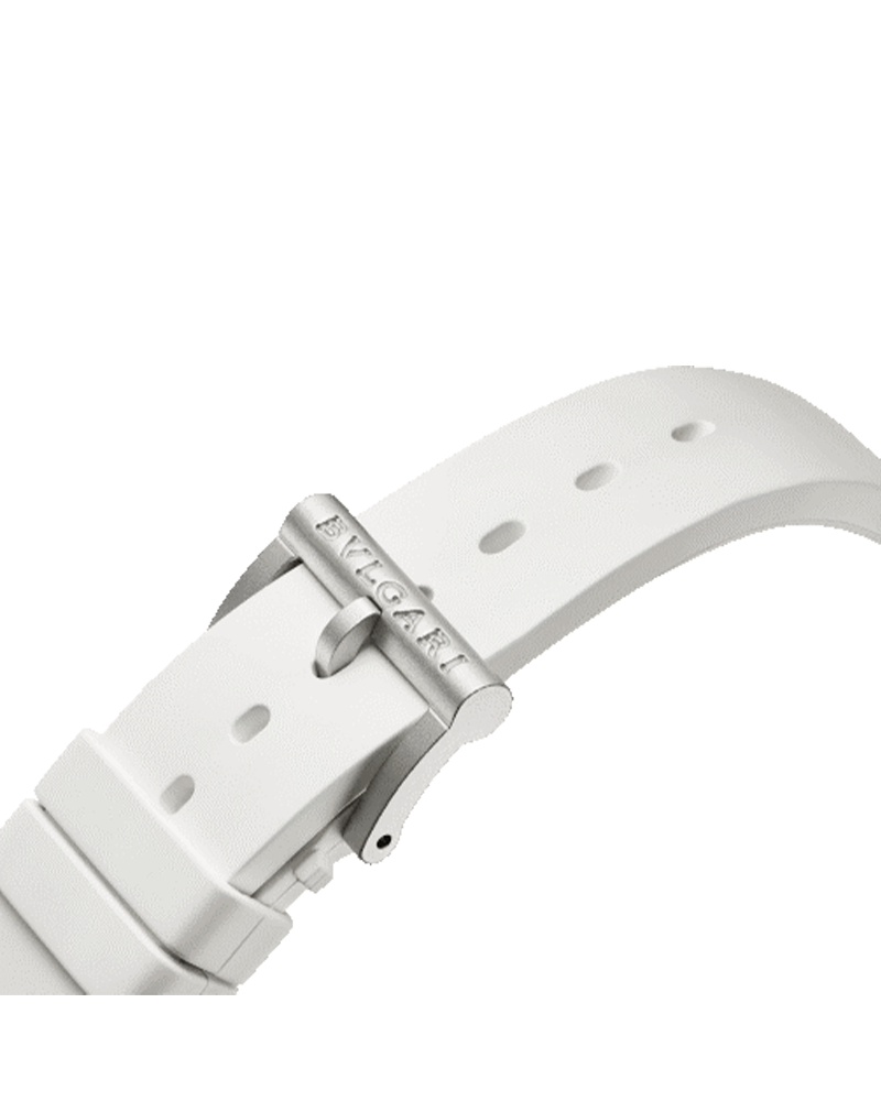 Bvlgari Aluminium White Automatic Special Edition watch with mechanical manufacture movement, automatic winding, hours, minutes, seconds and date functions, B77 calibre, 42-hour power reserve, 40 mm aluminium case, white rubber bezel with Bvlgari Bvlgari engraving, titanium crown, white dial, rhodium-plated indexes and hands, date opening at 3 o'clock, DLC-coated titanium caseback, white rubber bracelet with aluminium links and pin buckle. Water-resistant up to 100 metres. Limited edition of 1,000 pieces.