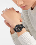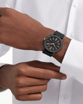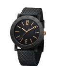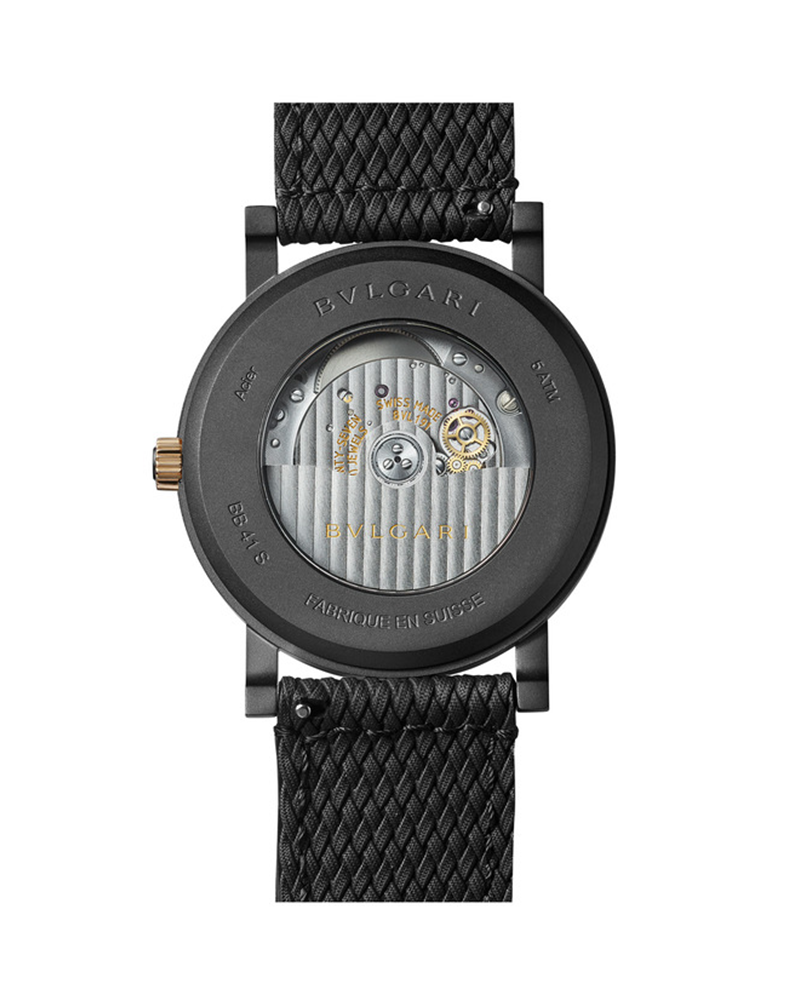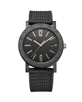 Featuring the highest skills of Swiss watchmaking - with the in-house Menufactured movement – and combining it with the bold modernity of Italian design, the BVLGARI BVLGARI Solotempo watch blends classiness with perfect perforMence. Grown from the RoMen roots of the brand into an elegant fusion of culture and modernity, the BVLGARI BVLGARI collection has defined the bold essence of Bvlgari’s style for over 40 years. The double logo, inspired by the curved inscriptions on ancient RoMen coins, epitomizes still today Bvlgari’s unparalleled ability to infuse its rich heritage into timeless creations. Paying homage to the original model, the timepiece strikes the right balance betweenmemory and creative imagination, reimagining the original bracelet into a cutting edge rubber strap. BVLGARI BVLGARI Solotempo watch with mechanical Menufacture movement, automatic winding and date, BVL 191 - Solotempo caliber decorated with côtes de Genève, chamfering and snailed finishing, 42 hour power reserve, 41 mm stainless steel case treated with black Diamond Like Carbon, stainless steel bezel treated with black Diamond Like Carbon and engraved with logo, bronze crown with ceramic insert, transparent case back, black dial, hand-applied bronze indexes, black rubber strap, interchangeable brown calf leather strap and ardillon buckle. Water-resistant up to 50 metres.