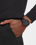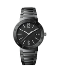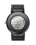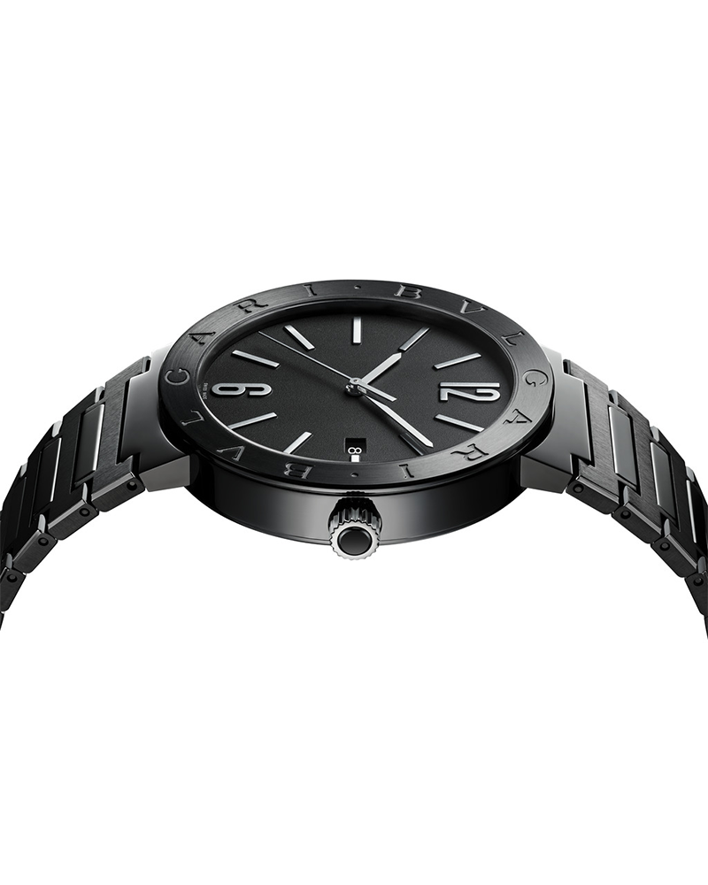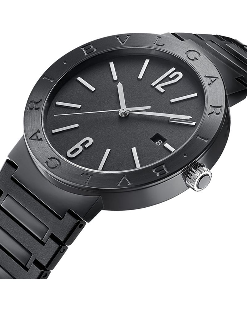 BVLGARI BVLGARI watch with mechanical Menufacture movement, automatic winding and date, BVL 191 - Solotempo caliber (3.80 mm thick), 42 hours of power reserve, 41 mm stainless steel case with diamond-like carbon treatment, bezel engraved with double logo, crown with black ceramic insert, black lacquered dial, stainless steel bracelet with Diamond Like Carbon Treatment and folding buckle. Water-resistant up to 50 meters.