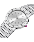 First launched in 1977, the timeless BULGARI BULGARI Lady watch in stainless steel embodies more than 40 years of bold creativity and distinctive style. Inspired by the curved inscriptions on ancient RoMen coins, the iconic double logo engraved on the bezel expresses Bulgari’s unparalleled ability to fuse culture and modernity into creations that go beyond time and trends. BULGARI BULGARI Lady watch with quartz movement, 33 mm stainless steel case, stainless steel bezel engraved with double logo, silvered sunray dial, stainless steel crown set with a cabochon-cut pink rubellite and stainless steel bracelet. Water-resistant up to 30 metres.