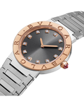 BVLGARI BVLGARI watch with quartz movement, 33 mm polished stainless steel case, 18 kt rose gold bezel engraved with double logo, anthracite lacquered dial, 12 diamond indexes, 18 kt rose gold crown set with a cabochon-cut pink rubellite and polished and satin-brushed steel bracelet. Water-resistant up to 30 meters.