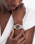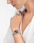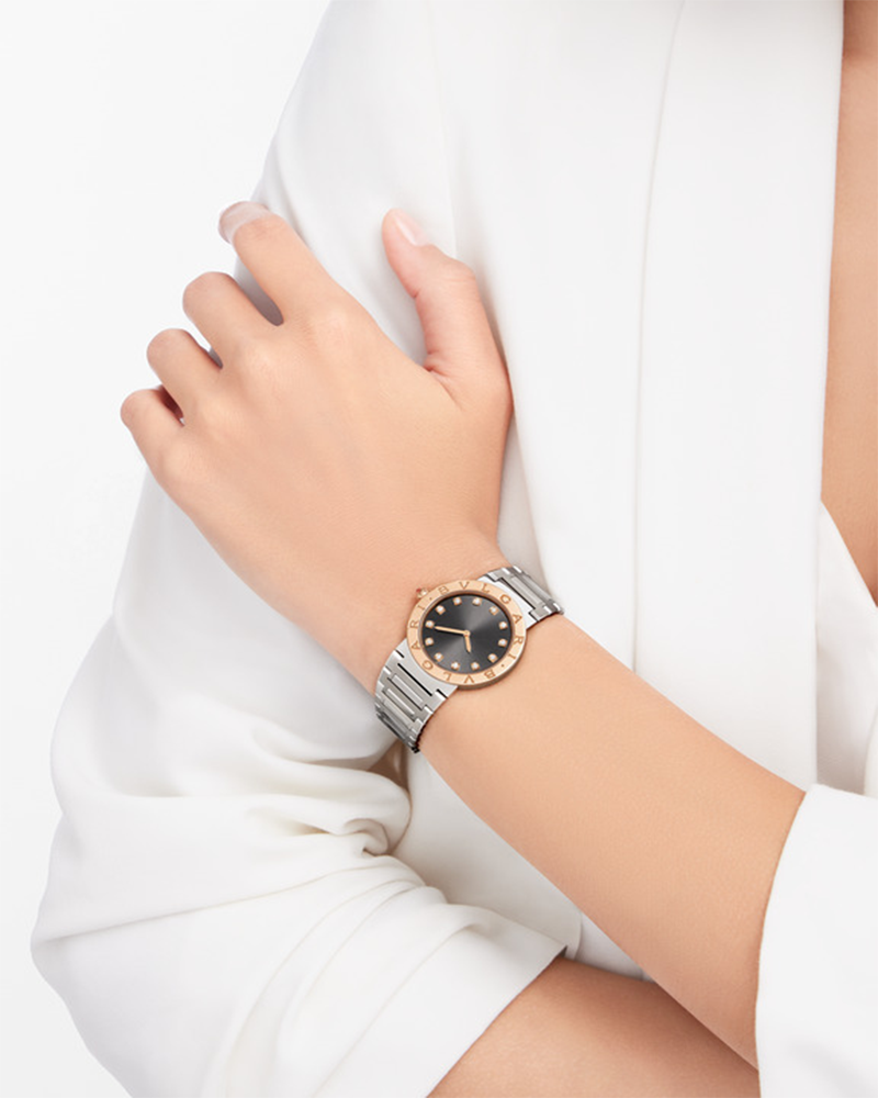 An evolution of the iconic model first launched in 1977, the timeless BVLGARI BVLGARI watch in polished and satin-brushed stainless steel with 18 kt rose gold bezel embodies more than 40 years of bold creativity and distinctive style. Inspired by the curved inscriptions on ancient Roman coins, the iconic double logo engraved on the bezel expresses Bulgari’s ability to fuse heritage and modernity into creations that go beyond time and trends. In an elegant play of contrasts, the anthracite lacquered dial is lit by diamond indexes.