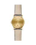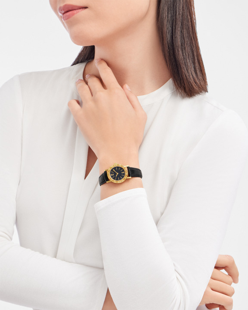 A reinterpretation of the iconic model first launched in 1977, the timeless BULGARI BULGARI watch with an 18 kt yellow gold case and black leather bracelet embodies a story of bold creativity and innovative Italian style. Inspired by the curved inscriptions on ancient Roman coins, the unmistakable double logo engraved on the bezel propelled the brand's name to the status of iconic design Maison, for a watch that sparked a revolution and remains a powerful reference point that transcends both time and trends. In an elegant play on contrasts, the black opaline dial is lit by gold-coloured hands and indexes.