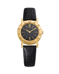 BULGARI BULGARI watch with quartz movement, hours and minutes functions, 26 mm 18 kt yellow gold case, 18 kt yellow gold bezel engraved with double logo, black opaline dial, gold-coloured hands and indexes, 18 kt yellow gold crown, black leather stitched bracelet, and 18 kt yellow gold ardillon buckle. Water-resistant up to 30 metres.