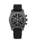 The CHRONOMASTER Revival Shadow mimics the look of an obscure ZENITH chronograph prototype from the 1970s that featured a blackened case. Here, the stealthy look is reproduced with an entirely matte finished titanium case. The black dial foregoes the seconds track and the date window. Paired with a black cordura effect rubber strap.