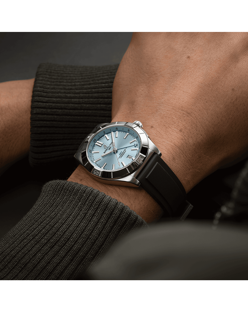 Caliber Breitling 32 Movement Self-winding mechanical, 2nd timezone (24 hr) Power reserve Approx. 42 hours Vibration 28,800 v.p.h Jewel 21 jewels Calendar Dial aperture CASE Case material Stainless steel & platinum Water resistance 200 m (660 ft) Bezel Unidirectional, ratcheted Crown Screw-locked, two gaskets Crystal Cambered sapphire, glareproofed both sides DIMENSIONS Product Weight (Approx.) 110.8 g. Watch-head Weight (Approx.) 81.5 g. Diameter 40.0 mm Thickness 11.7 mm Height (upper lug tip to lower lug tip) 47.4 mm Lug width (in-between lug) 20.0 mm STRAP Strap material Rubber Strap color Black Strap type Straight Lug 20/18 mm Buckle Material Stainless steel Buckle type Folding clasp Buckle size 18 mm