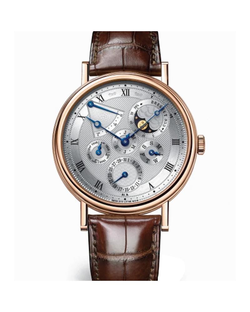 Self-winding movement engraved by hand, with perpetual calendar showing the day, date, month, leap year and the phases and age of the moon. Balance spring and lever in silicon. Power-reserve indicator. Silvered gold dial, hand-engraved on a rose engine. Sapphire caseback.
