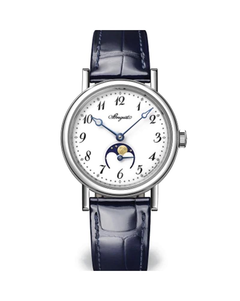 Case in 18-carat rose gold with a delicately fluted caseband. Sapphire-crystal caseback Dial individually numbered and signed Breguet. Hours chapter with Roman numerals. Moon-age and -phase indicator, plus small seconds at 6 o clock. Breguet open-tipped hands in blued steel.