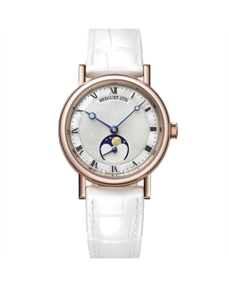 Case in 18-carat rose gold with a delicately fluted caseband. Sapphire-crystal caseback.Welded lugs with screw bars.Dial individually numbered and signed Breguet. Hours chapter with Roman numerals. Moon-age and -phase indicator, plus small seconds at 6 oÕclock. Breguet open-tipped hands in blued steel.