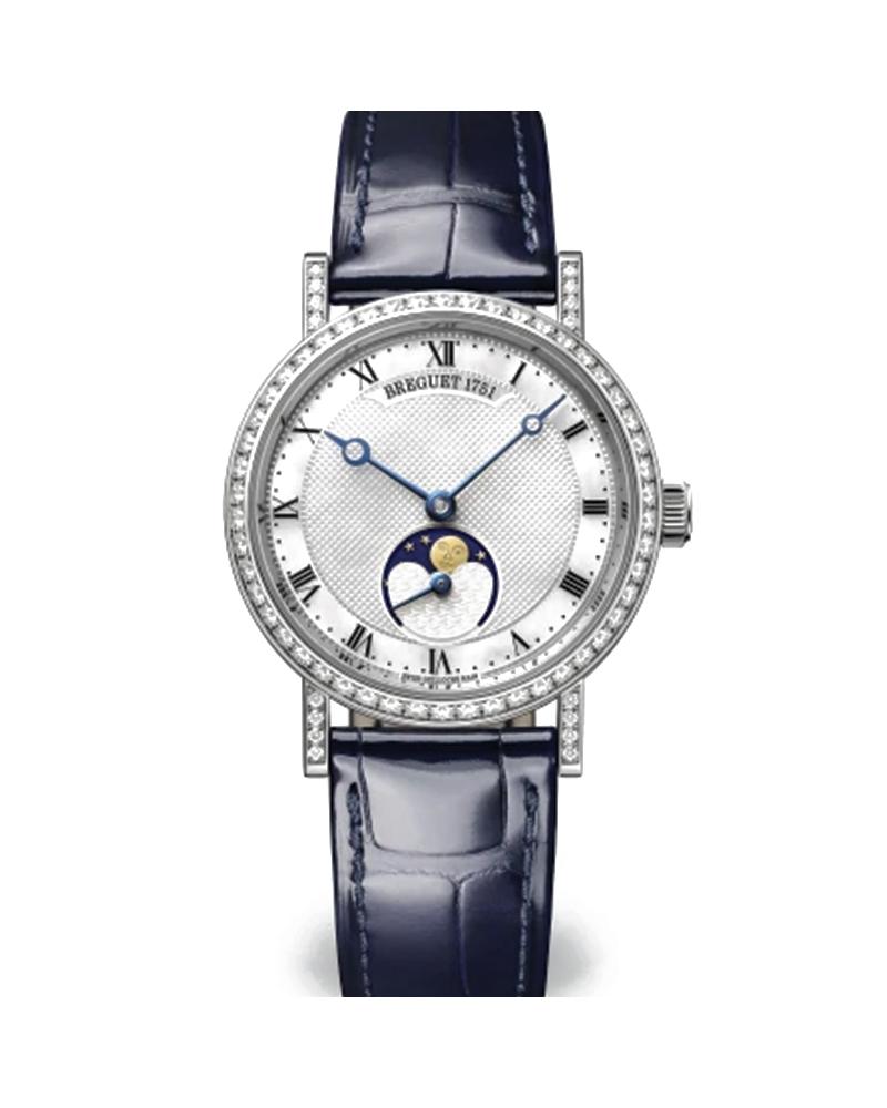 Case in 18-carat rose gold with a delicately fluted caseband with diamond bezel. Sapphire-crystal caseback Dial individually numbered and signed Breguet. Hours chapter with Roman numerals. Moon-age and -phase indicator, plus small seconds at 6 o clock. Breguet open-tipped hands in blued steel.