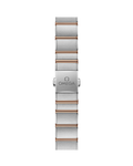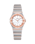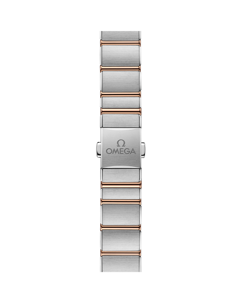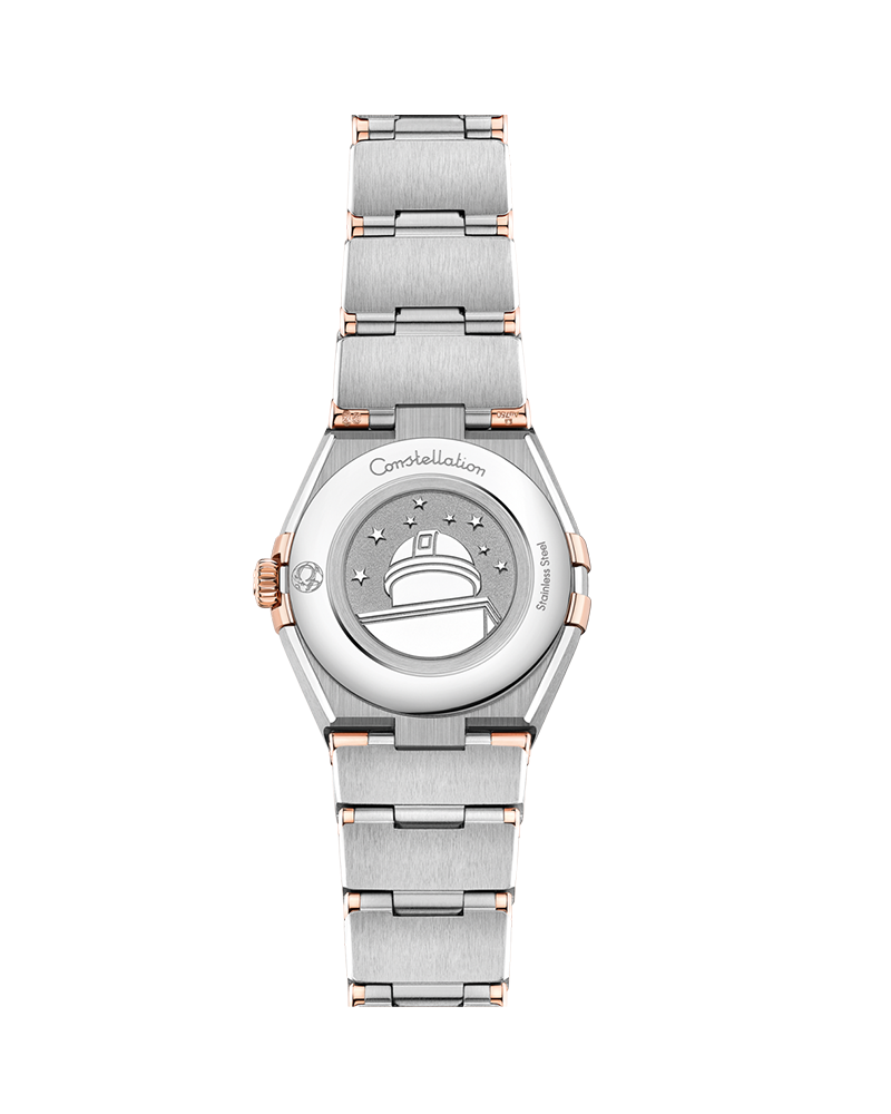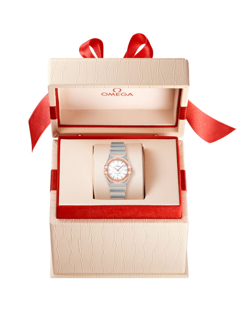This 25 mm 18K Sedna™ gold and stainless model features a bezel engraved with Roman numerals, white mother-of-pearl dial and scratch-resistant saphire crystal. The hands, OMEGA logo, Constellation star and indexes are also in 18K Sedna™ gold.