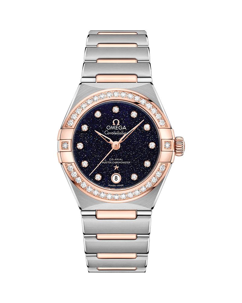 This 29 mm 18K Sedna gold and stainless steel model features a diamond-paved bezel, blue aventurine glass dial with diamond hour markers and a date window at the 6 o clock position. The hands, OMEGA logo, Constellation star and diamond holders are also in 18K Sedna gold.