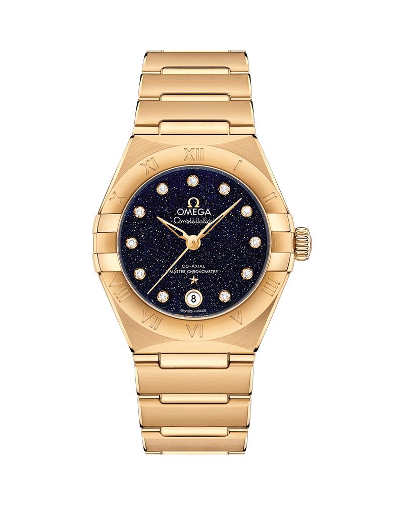 This 29 mm 18K yellow gold model features a bezel with engraved Roman numerals, blue aventurine glass dial with diamond hour markers and a date window at the 6 o clock position. The bracelet, hands, OMEGA logo, Constellation star and diamond holders are also in 18K yellow gold.