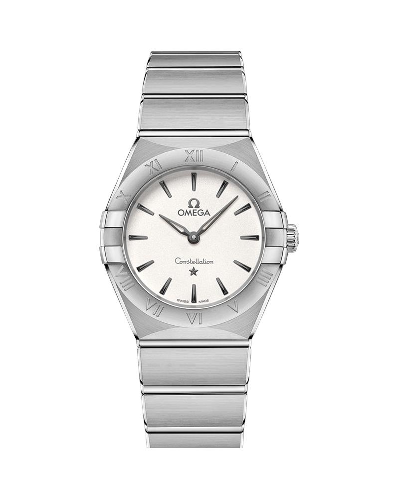 This 28 mm stainless steel model features a bezel engraved with Roman numerals, crystal white silvery dial and scratch-resistant saphire crystal. The blackened hands, OMEGA logo, Constellation star and indexes contrast beautifully with the white dial.