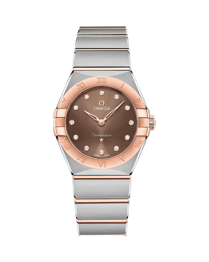 This 28 mm 18K Sedna gold and stainless steel model features a bezel engraved with Roman numerals, sun-brushed brown dial with diamond hour markers and scratch-resistant sapphire crystal. The hands, OMEGA logo, Constellation star and diamond holders are also in 18K Sedna gold.