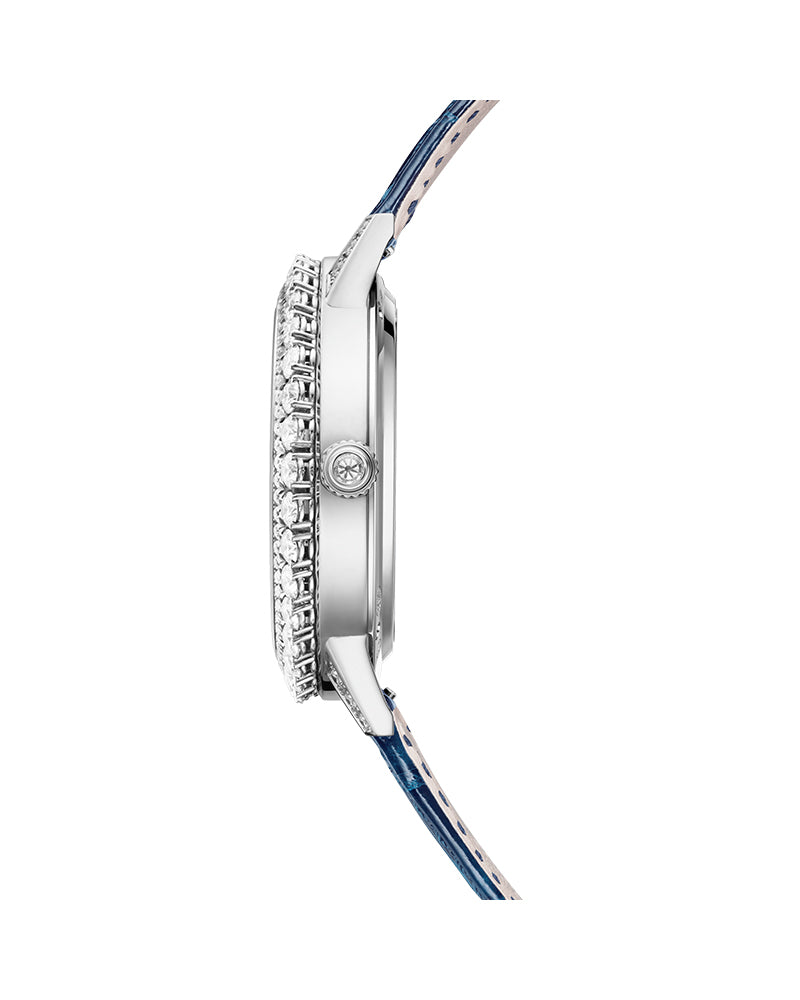 Under the reflection of light, the Dazzling Rendez-Vous Moon timepiece delivers a sparkling shine. In an aperture at 6 o clock, a new moon phase stands out in all its femininity and lightness. Set against the background of a starry sky blanketed by a sea of immaculate clouds, the star of the pearly night evolves gracefully. An icon of the Rendez-Vous collection, the watchÕs round form is magnified by the gem-claw setting of its diamond-adorned bezel. A watchmaking spectacle that the night will never tire of...
