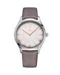 The slim 39 mm case is made from stainless steel and features diamond paving that curves along each side, as well as a crown that is polished with red "HyCeram" and set with a single diamond. The lacquered opaline silver dial includes embossed 18K Sedna™ gold Roman numerals, which is the same material used for the hands.