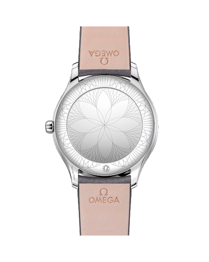 The watch is driven by the OMEGA calibre 4061, which sits behind a special mirrored caseback with a “Her Time” pattern. Finally, the watch is presented on a grey fabric strap.