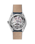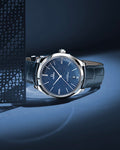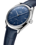 This model has a 40 mm stainless steel case, which is presented on a blue leather strap. The domed blue patterned dial includes a date window at 6 o'clock as well as hands and indexes in 18K white gold.