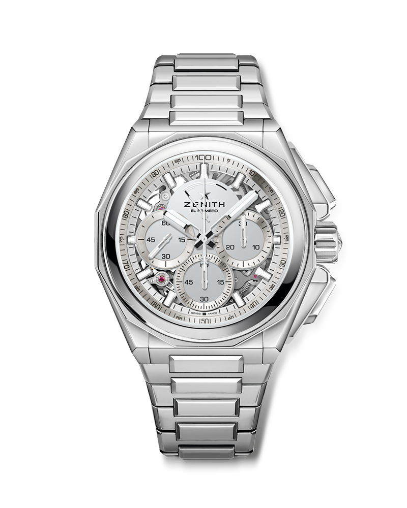 The DEFY Extreme Mirror 1/100th of a second chronograph takes on a futuristic and highly reflective camouflage that blends in with its environment. Crafted entirely in mirror-polished stainless steel. The sapphire dial with applied counters reveals the El Primero 21 automatic high-frequency movement with two escapements beating at 50Hz and 5Hz. The DEFY Extreme watch comes with a steel bracelet as well as a black rubber strap and a Velcro strap.