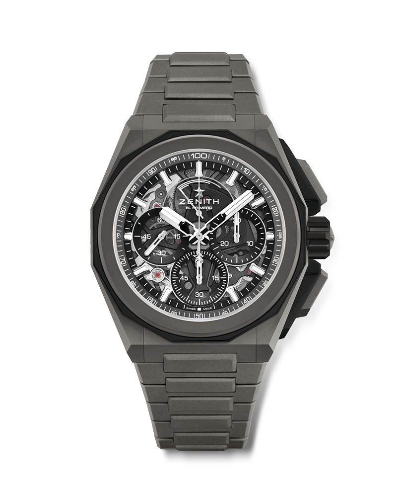 The DEFY Extreme 1/100th of a second chronograph is made in light yet robust titanium with an entirely matte finish. The tinted sapphire dial with applied counters reveals the El Primero 21 automatic movement with two escapements beating at 50Hz and 5Hz. The DEFY Extreme watch comes with a titanium strap as well as a rubber strap and a Velcro strap.