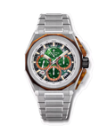 Limited to 50 pieces, the DEFY Extreme Jungle edition draws inspiration from the untamed energy and captivating mystery of the jungle. Crafted in titanium, this 1/100th of a second chronograph features a bezel and pusher protectors crafted in Tiger's Eye. Each watch is unique due to the natural variations in this captivating gemstone with golden to brown hue. The open sapphire dial is tinted in green and paired with tiger-colored applied counters.