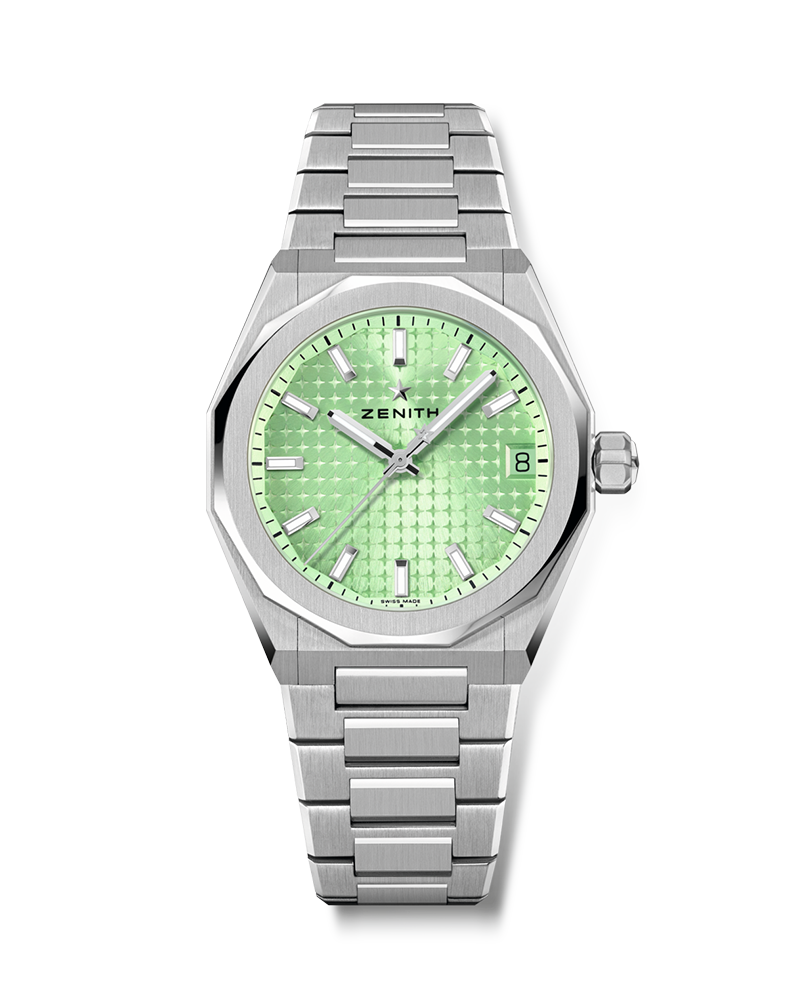 DEFY Skyline in a 36mm steel octagonal case with a faceted bezel, featuring a metallic pastel green sunburst-patterned dial revisiting the emblematic ZENITH four-pointed star. Powered by the Elite 670 automatic manufacture movement. Interchangeable steel bracelet and green patterned rubber strap.