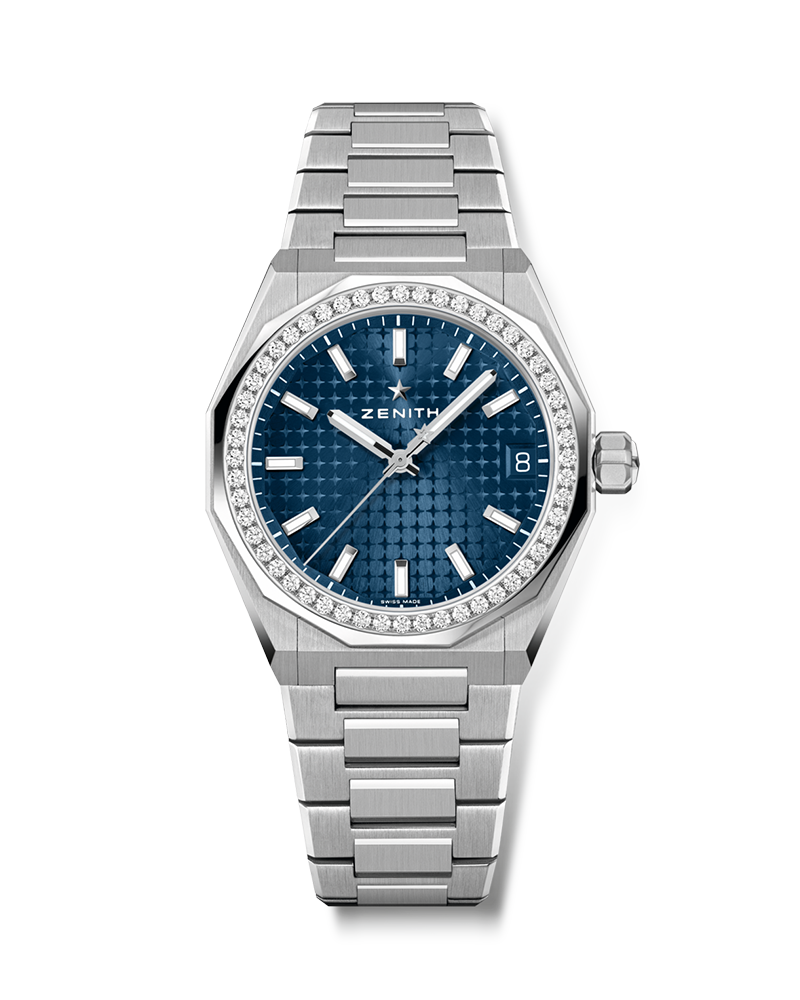 DEFY Skyline in a 36mm steel octagonal case with a faceted diamond-set bezel, featuring a blue sunburst-patterned dial revisiting the emblematic ZENITH four-pointed star. Powered by the Elite 670 automatic manufacture movement. Interchangeable steel bracelet and blue patterned rubber strap.