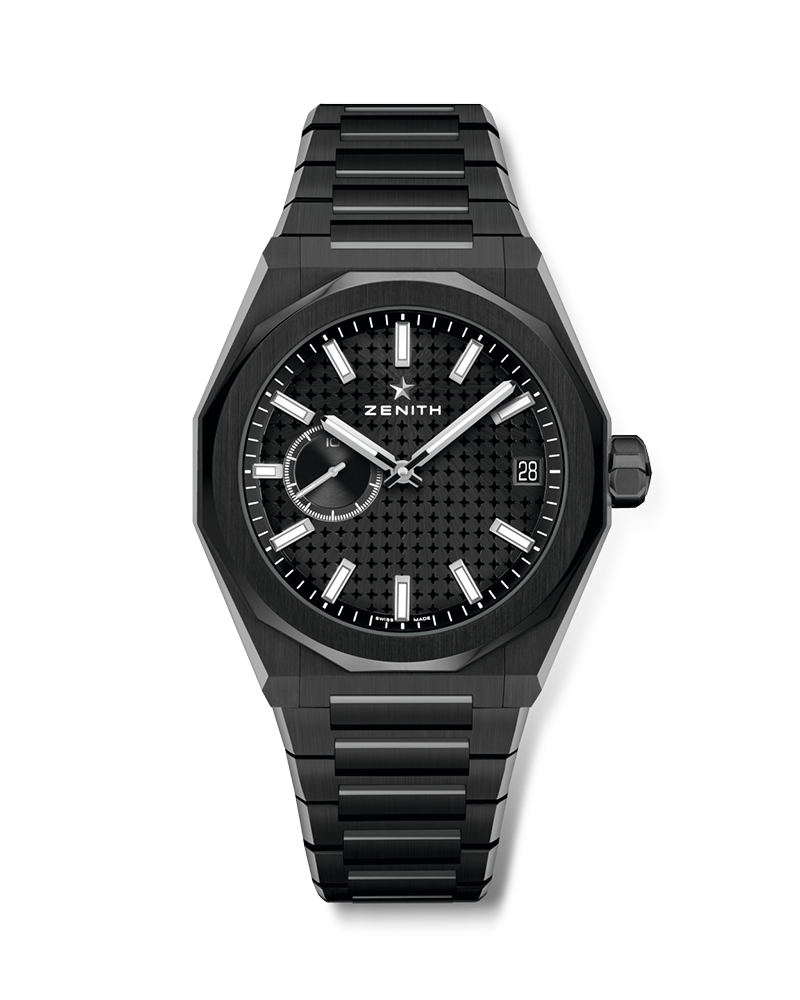 DEFY Skyline in a 41mm black ceramic octagonal case with a faceted bezel, featuring a black sunburst-patterned dial revisiting the emblematic ZENITH four-pointed star. Powered by the El Primero 3620 high-frequency automatic manufacture movement with the very first 1/10th of a second indicator. Interchangeable ceramic bracelet, with a black patterned rubber strap.