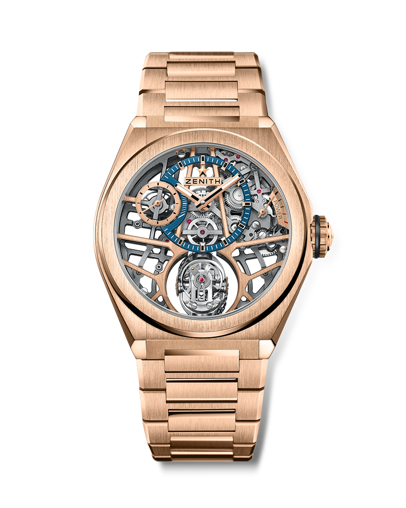 Counteracting the effects of gravity at all times and regardless of the watch's position, the DEFY Zero G features the latest generation of the ingenious ZENITH gyroscopic "Gravity Control" gyroscopic regulating organ module in a skeleton movement, housed in a 44mm 18k rose gold case and integrated rose gold bracelet.