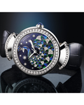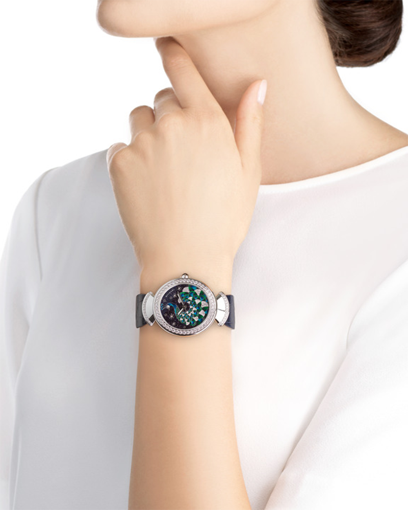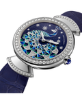 The DIVAS’ DREAM timepiece is inspired by the patterned Roman mosaics of the Baths of Diocletian, where the motif of the peacock reigns sovereign as the symbol of vanity and supreme beauty. Preening with sophistication, this creation reveals the precious colour combinations of the fanned tail of the regal animal and celebrates with a precious design the pure beauty of the iconic fan shaped motif. DIVAS' DREAM watch with manufacture mechanical movement, automatc winding, BVL 191 caliber, 37 mm 18 kt white gold case set with brilliant-cut diamonds on the bezel, 18 kt white gold crown set with a sapphire, 18 kt white gold link set with brilliant-cut diamonds, aventurine dial with a hand-painted peacock set with diamonds, dark blue leather strap, 18 kt white gold folding clasp. Water resistant up to 30 metres.
