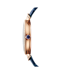 The DIVAS’ DREAM timepiece is inspired by the patterned Roman mosaics of the Baths of Diocletian, where the motif of the peacock reigns sovereign as the symbol of vanity and supreme beauty. Preening with sophistication, this creation reveals the precious colour combinations of the fanned tail of the regal animal and celebrates with a precious design the pure beauty of the iconic fan shaped motif. DIVAS' DREAM watch with manufacture mechanical movement, automatique winding, BVL 191 caliber, 37 mm 18 kt rose gold case set with brilliant-cut diamonds on the bezel, 18 kt rose gold crown set with a sapphire, 18 kt rose gold link set with brilliant-cut diamonds, mother-of-pearl dial with hand-painted peacock set with diamonds, dark blue leather strap and 18 kt rose gold folding clasp. Water resistant up to 30 metres.